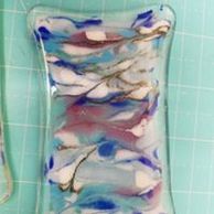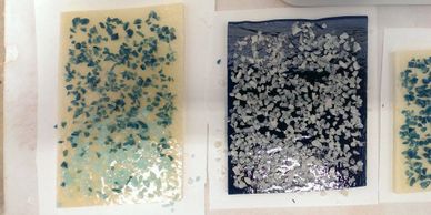 Out of the kiln after a full fuse to 1480 degrees. After exposure to high heat, some colors turn darker (the glass world term for these are "strikers". Maybe they are really good bowlers), so you have to research if you want to know what the final color will be. Or just wing it and hope for the best if you're feelin' lucky!