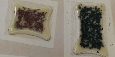 Some glasses will react when they come into contact with each other. This is due to the substances in the glass that create the color. For example, the sulfur in French vanilla will react with the copper in Steel Blue (and many other blues). Where the two contact each other, a brown border will be visible. There are a lot of ways glass reactions can be used for designing jewelry and other glass pieces. For this reaction pendant, I created partial sheets using a base glass with a reactive frit (crushed glass) on top