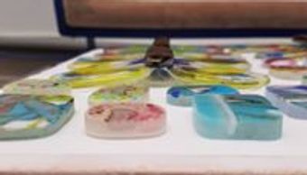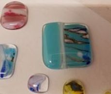 The glass can also be cut up into smaller pieces and fashioned into jewelry. Which requires a few more firings to get it formed and polished. These pendants took a total of 5 fuses! Crikey!