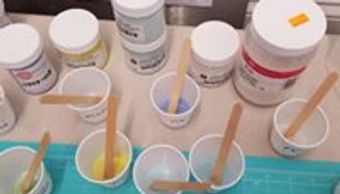 I add a few spoonfuls of the glass powder to a cup then pour in a little distilled water. After a stir with the popsicle stick, a slushy slurry is born!