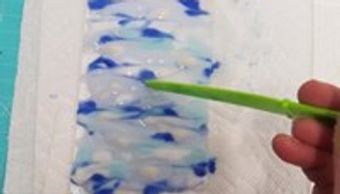 Here I have laid out a variety of blues and lavender, mixed with French vanilla and white. I know that the French vanilla will have a chemical reaction with some of the blues, which will give some nice contrasting lines! I drag a knife (or sometimes another pointy object) through the powders to mingle the colors.