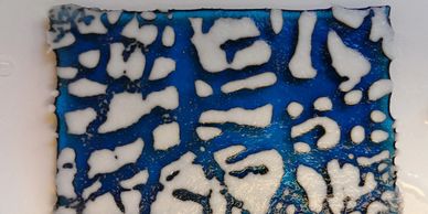 So now you have little pools of glass that need to be attached to something. Like, I don't know, perhaps a sheet of glass? Seems logical. I place a solid piece of glass on top, then fuse it a second time. When it comes out of the kiln, the frax is removed. It's still rough on the bottom and edges due to the texture of the frax (I like to call these the Shards of Death. If you accidentally spear your finger on one, you will understand why. You will also understand why band-aids have a spot on my shelves. Lots and lots of band-aids.) The edges need grinding to make them Bumps of Tolerance. (These are not technical terms). A clear piece of glass is placed on top, to cap it.